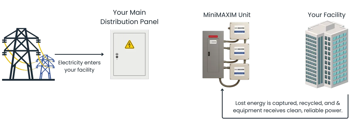 MiniMAXIM is an all-in-one energy management system engineered to maximize power efficiency across your entire facility. It recycles wasted electricity, balances and boosts voltage, delivers comprehensive surge protection, and extends the life of all powered equipment.