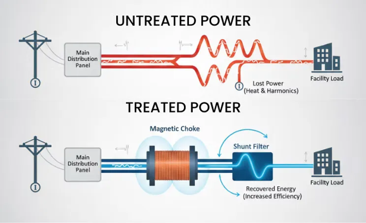 Energy Conditioning Unit is an all-in-one energy management system engineered to maximize power efficiency across your entire facility. It recycles wasted electricity, balances and boosts voltage, delivers comprehensive surge protection, and extends the life of all powered equipment.